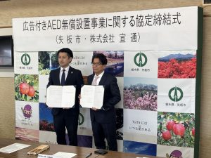矢坂市役所広告付きAED無償設置事業に関する協定を締結 お知らせ 2026.04.23 2026年4月17日(金曜日)に「矢坂市役所広告付きAED無償設置事業に関する協定」を締結し、協定締結式を行いました。